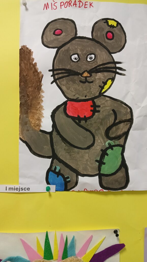 I miejsce: Bartosz Pawlik za wykonanie Maskotki „Miś Poradek”, prowadzony przez mgr Jolantę Machurę – z Zespołu Szkolno – Przedszkolnego w Żelisławicach