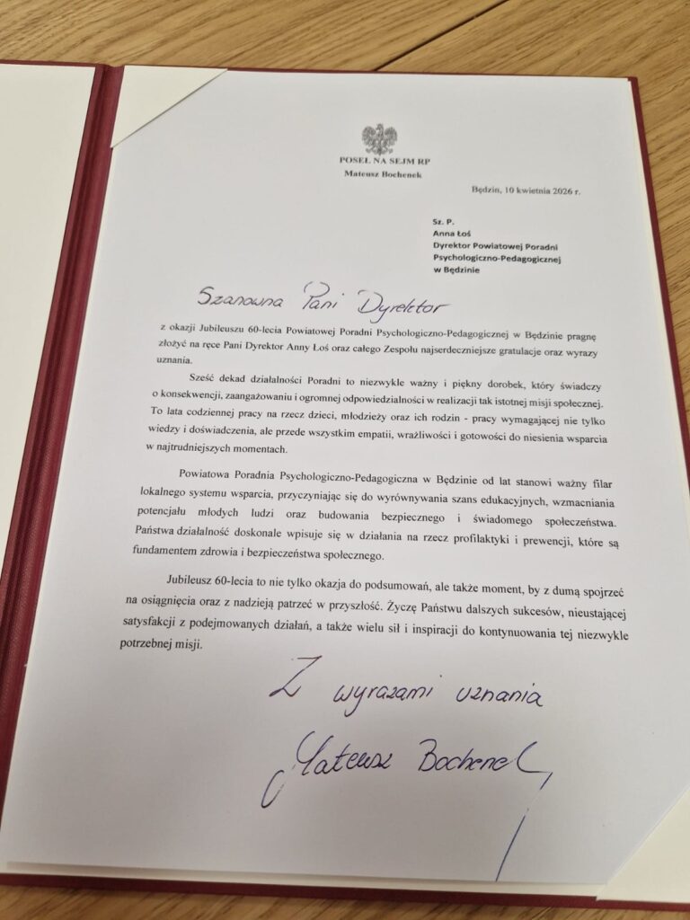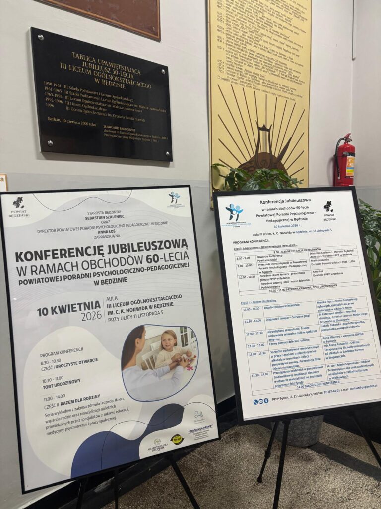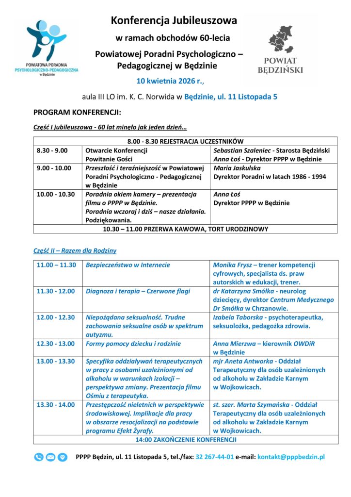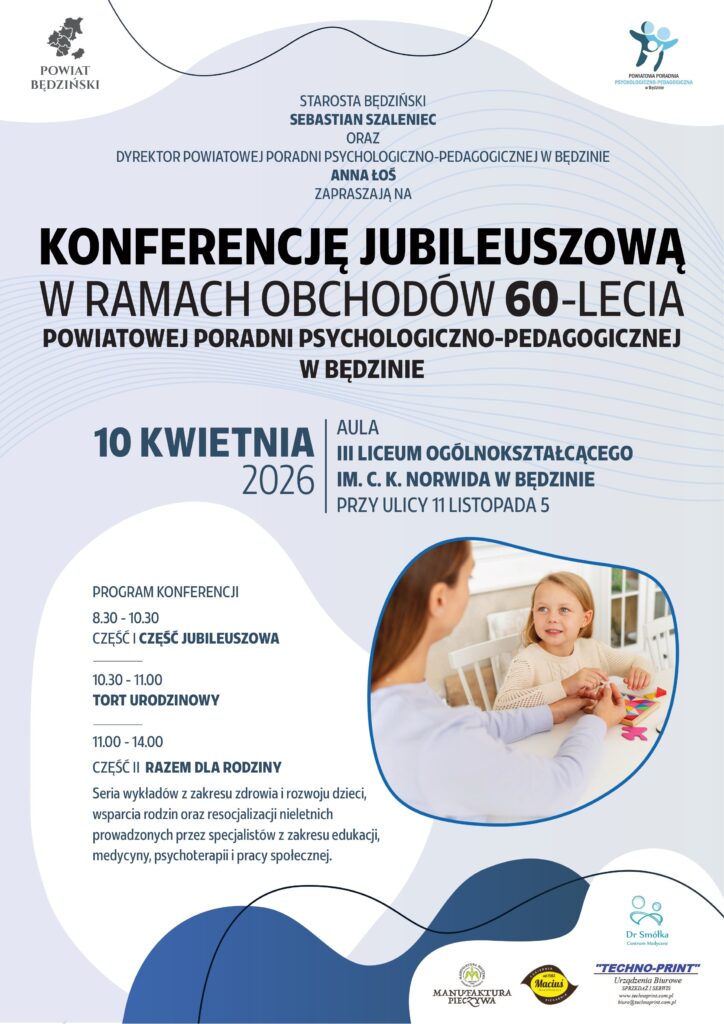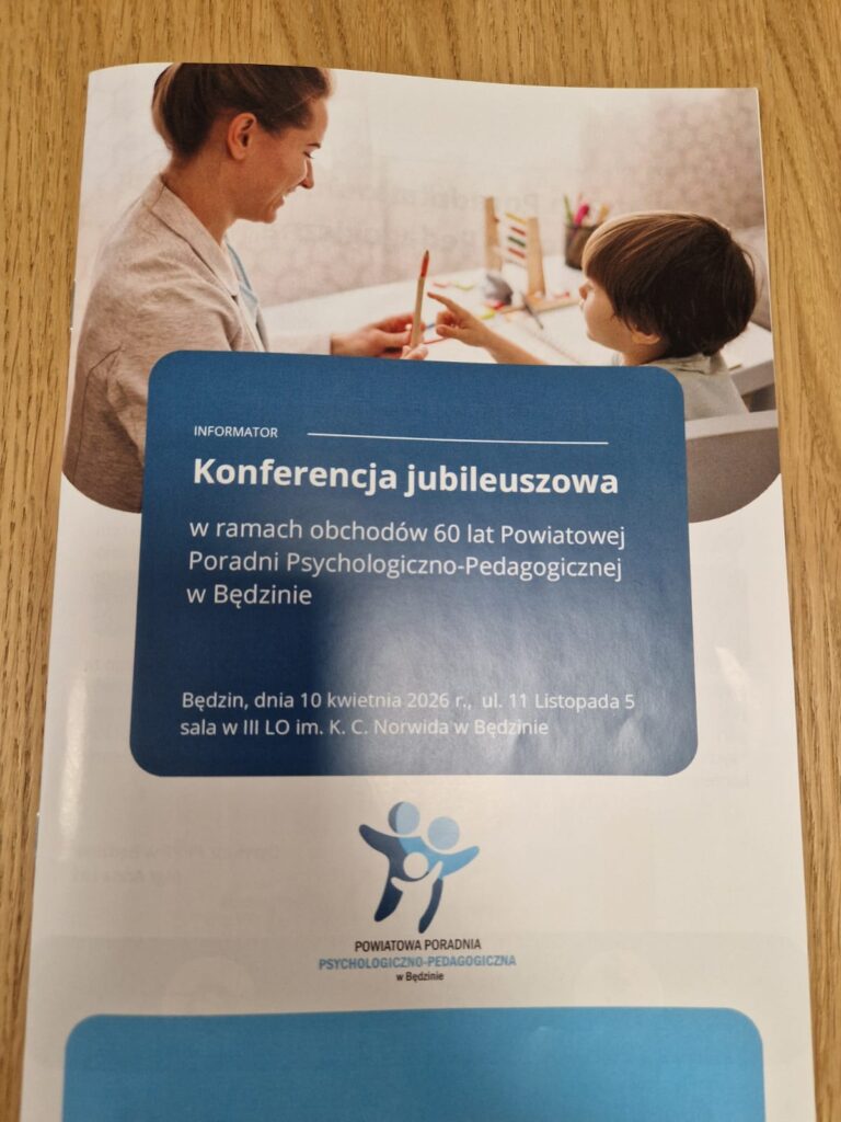 Serdecznie zapraszamy specjalistów z Państwa placówki (psychologów, pedagogów, pedagogów specjalnych oraz logopedów) do udziału w Konferencji Jubileuszowej w ramach obchodów 60-lecia Powiatowej Poradni Psychologiczno – Pedagogicznej w Będzinie, która odbędzie się 10 kwietnia 2026 r., w auli III LO im. K. C. Norwida w Będzinie, ul. 11 Listopada 5.