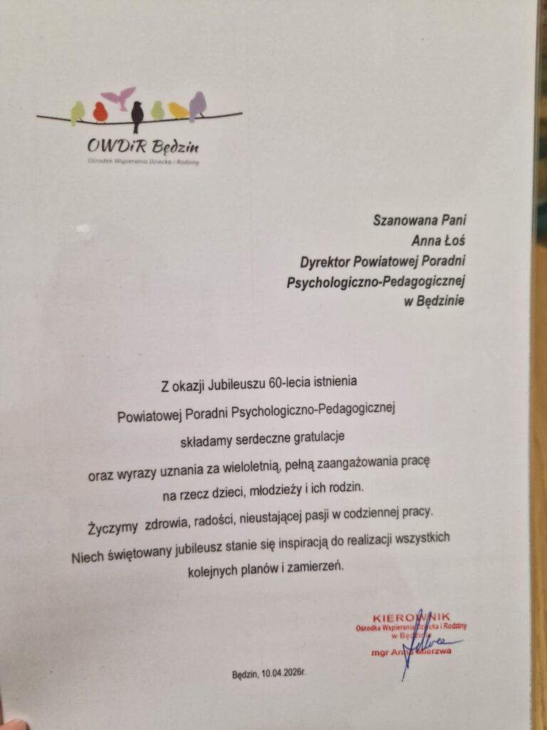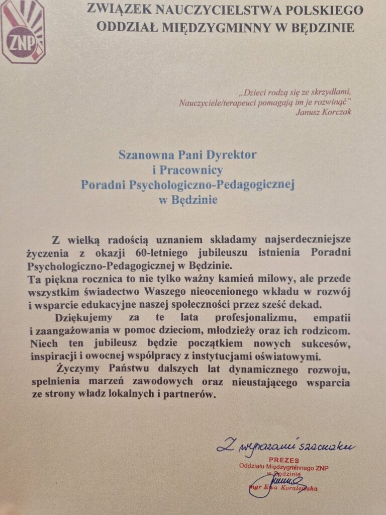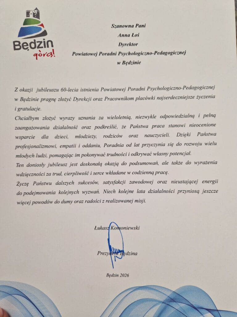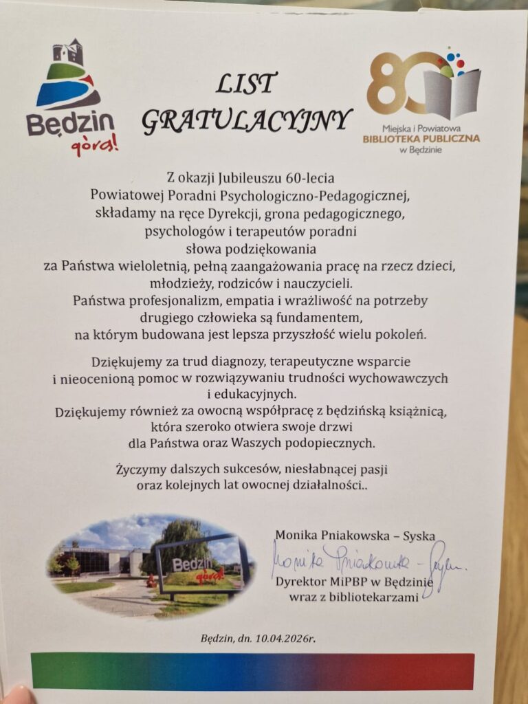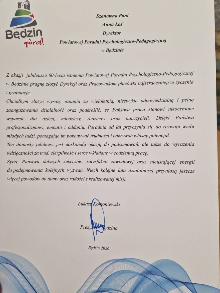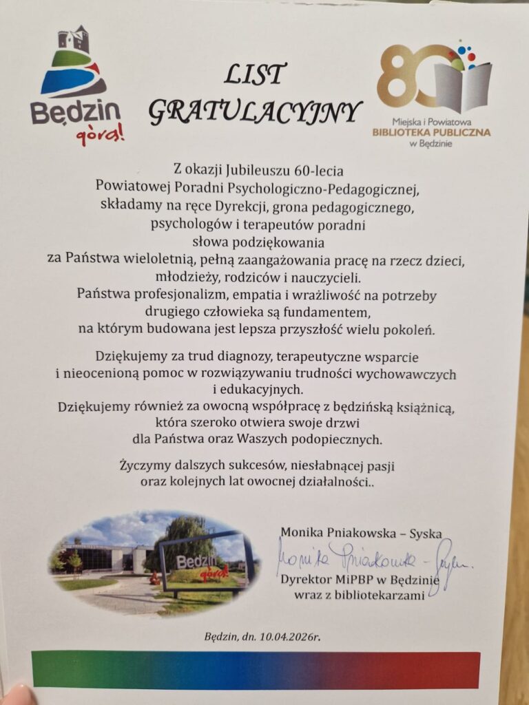 Jubileusz 60-lecia istnienia Powiatowej Poradni Psychologiczno-Pedagogicznej w Będzinie już za nami. Kiedy 60 lat temu rozpoczynała się działalność poradni, cel był jeden: być blisko dziecka jego rodziny i szkoły. Dziś cel ten realizujemy nieprzerwanie – reagując na współczesne wyzwania z jakimi mierzą się dzieci i młodzież, patrzymy w przyszłość z poczuciem odpowiedzialności.