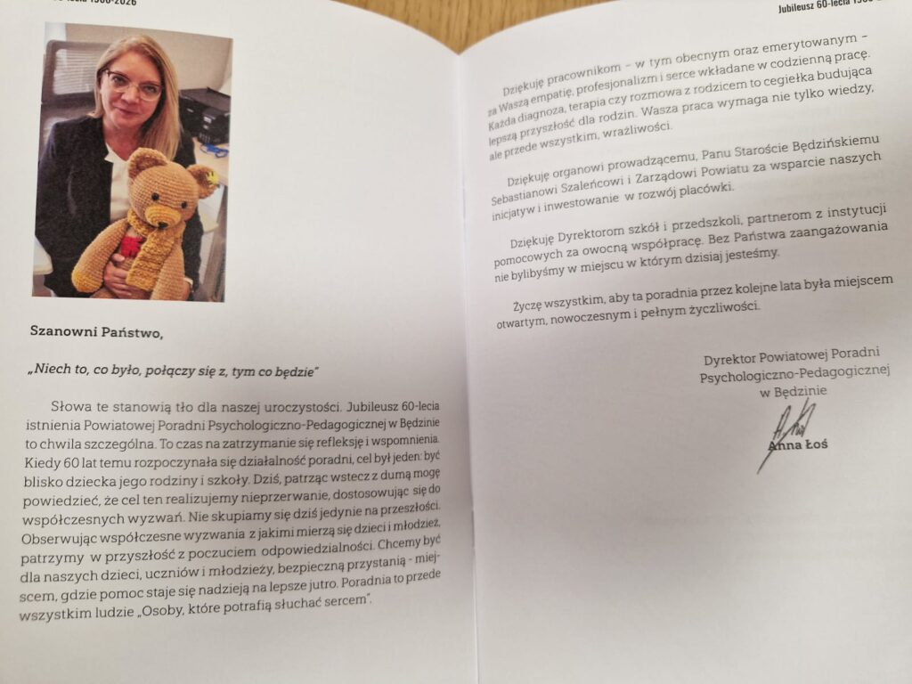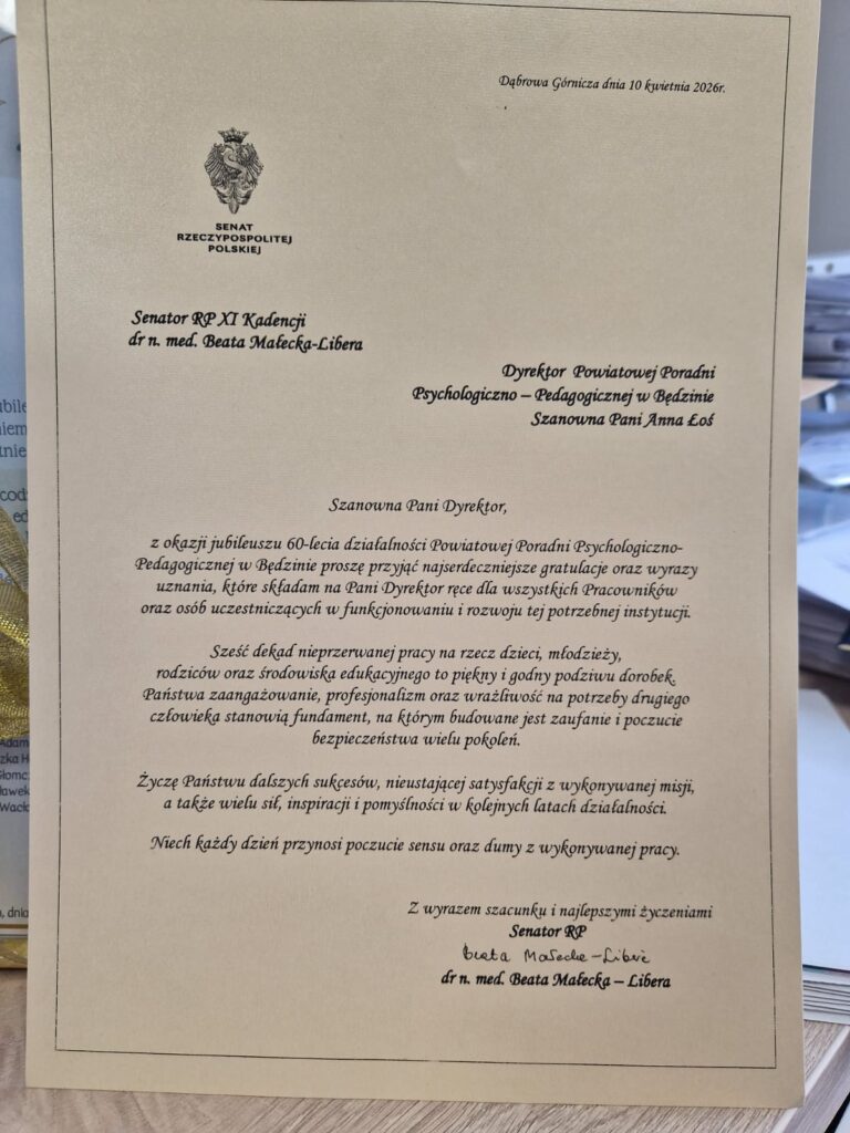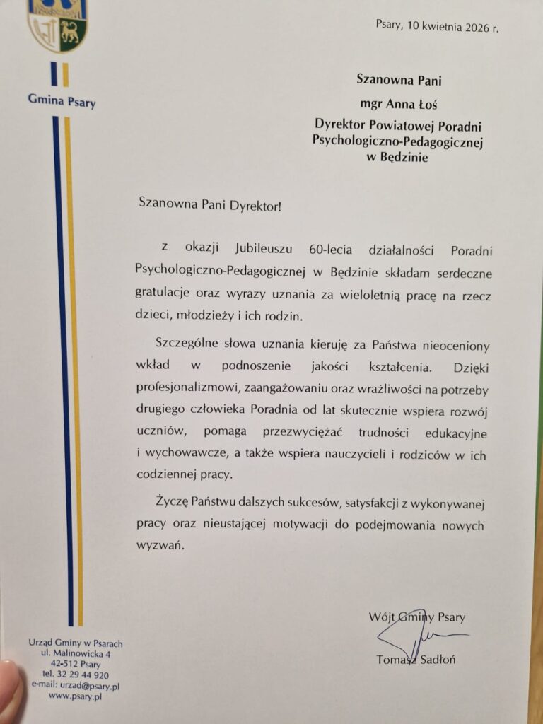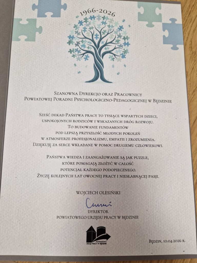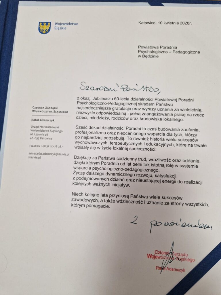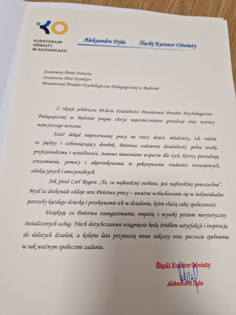 Jubileusz 60-lecia istnienia Powiatowej Poradni Psychologiczno-Pedagogicznej w Będzinie już za nami. Kiedy 60 lat temu rozpoczynała się działalność poradni, cel był jeden: być blisko dziecka jego rodziny i szkoły. Dziś cel ten realizujemy nieprzerwanie – reagując na współczesne wyzwania z jakimi mierzą się dzieci i młodzież, patrzymy w przyszłość z poczuciem odpowiedzialności.